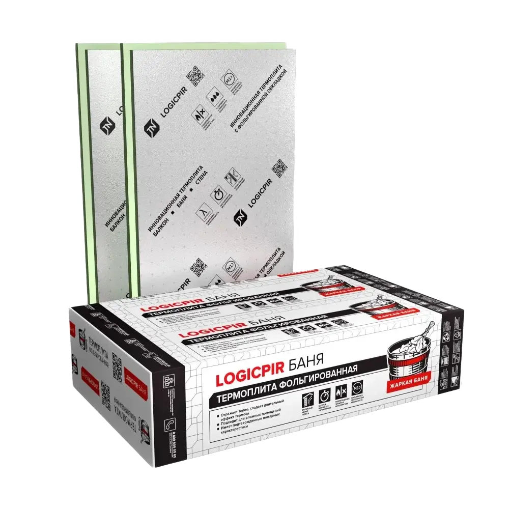 ТехноНИКОЛЬ LOGICPIR Баня Ф/Ф L-1190×590×50 (5 шт., 3,51 м²) — это теплоизоляционные плиты на основе пенополиизоцианурата (PIR) с фольгированным покрытием с обеих сторон. Материал предназначен для утепления бань, саун и бассейнов, где присутствуют экстремальные параметры влажности и температуры.